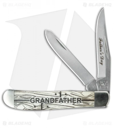 The 2015 special edition Mini Trapper from Bear & Son Cutlery is the perfect gift for your grandfather. This fine pocket knife features elegant smooth bone handles with a scrimshaw engraved front scale. This 3.5″ model has nickel silver bolsters and hollow ground 440 stainless steel clip and spey blades.