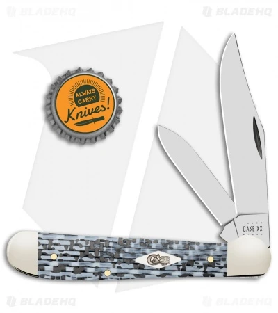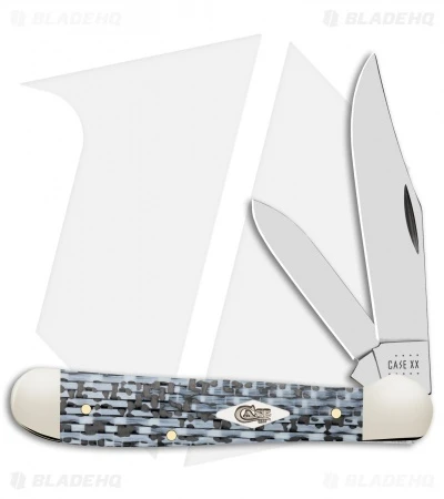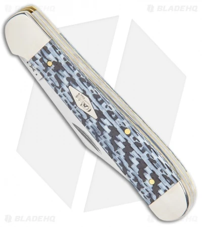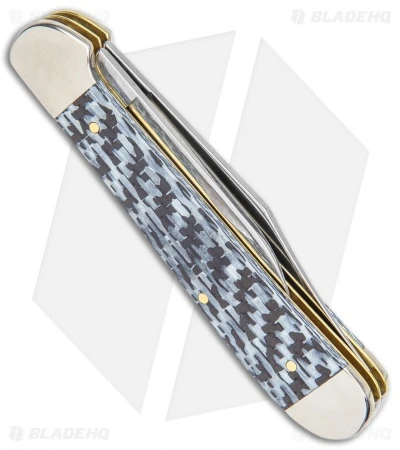 This Copperhead has a black and white carbon fiber handle and clip point and pen blades.