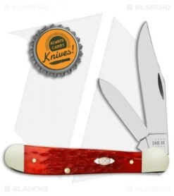 This Copperhead has a jigged dark red bone handle and clip point and pen blades.