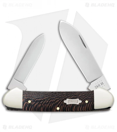 This Canoe pocketknife features a black sycamore wood handle and dual stainless steel blades. Instantly upgrade your knife collection with the Canoe Pocketknife from Case Knives. This model has a spear point and a pen style blade. Nickel silver bolsters and a Case logo inlay round out the collectible design.