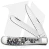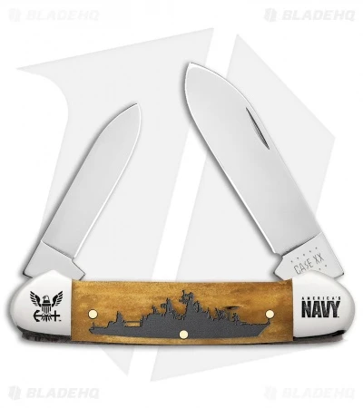 This Canoe pocket knife features an embellished U.S. Navy design and an antique smooth bone handle accompanied by dual stainless steel blades. Instantly upgrade your knife collection with the Canoe Pocket Knife from Case Knives. This model has a spear point and a pen style blade. Nickel silver bolsters and brass pinned construction round out the collectible design.