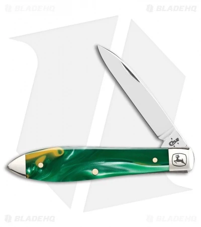 The Case John Deere Teardrop pocket knife with John Deere Kirinite scales is a fantastic addition to any collection. Tru-Sharp surgical stainless steel long spear blade is capable of any of your daily cutting tasks. A vivid swirl of green and yellow, John Deere Kirinite scales resists chipping, cracking, warping, and shrinking. Polished nickel silver bolsters with brass pins and liners complete this beautiful and unique knife.