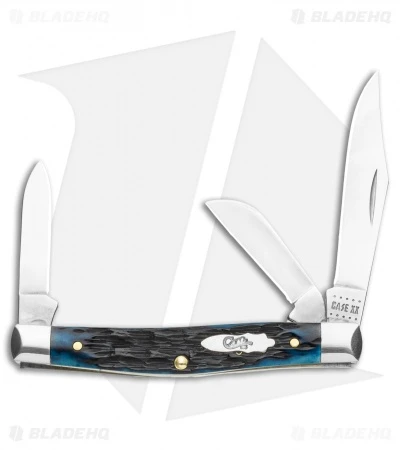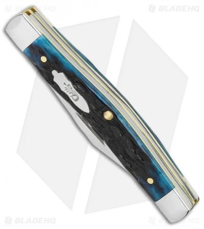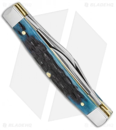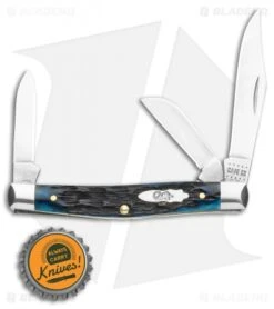 This Medium Stockman has a peach seed jigged denim blue bone handle.
