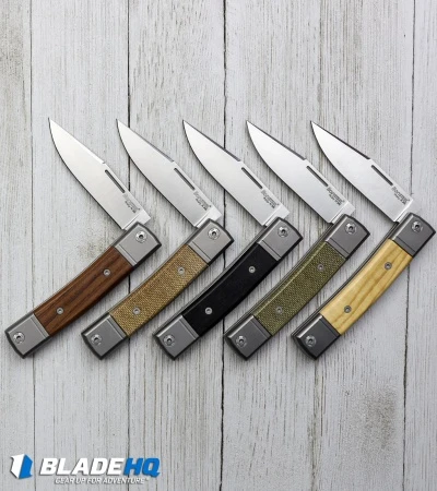 This model of the LionSteel BestMan sports a satin clip point blade made from Bohler M390. The titanium handle has olive wood inlays with titanium bolsters.