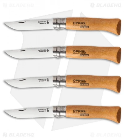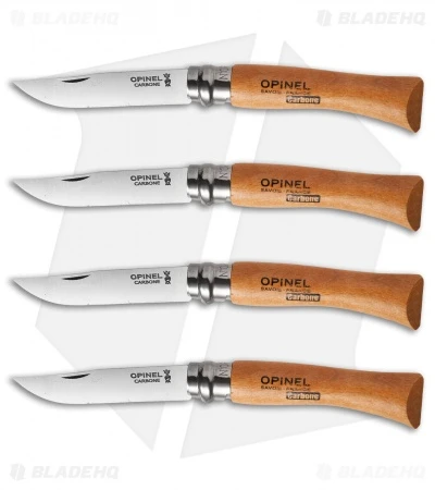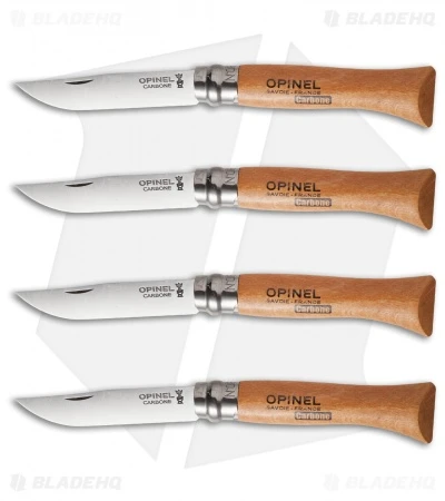 This set of 12 knives includes the No. 6, No. 7, and No. 8 models of the Opinel with carbon steel blades and beech wood handles. There are four of each model.