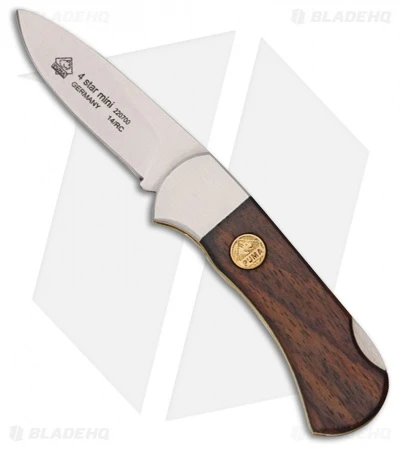 The Puma 4-Star Lockback Mini pocket knife is a small pocket friendly carry option. Made in Germany, the 440A stainless steel blade easily tackle your day-to-day cutting tasks. Smooth Jacaranda wood scales are attractive and comfortable in hand. Polished nickel silver bolster with brass liners complete a sturdy reliable pocket knife.